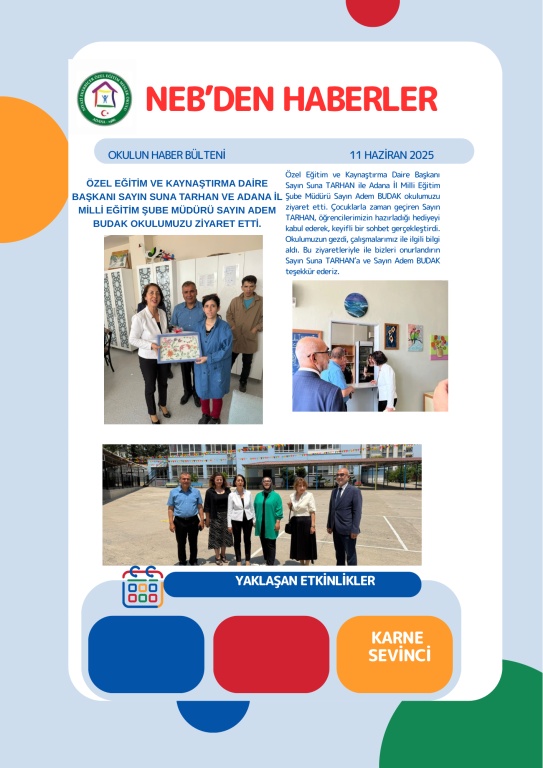 Özel Eğitim ve Kaynaştırma Daire Başkanı Sayın Suna TARHAN ile Adana İl Milli Eğitim Şube Müdürü Sayın Adem BUDAK okulumuzu ziyaret etti. Çocuklarla zaman geçiren Sayın TARHAN, öğrencilerimizin hazırladığı hediyeyi kabul ederek, keyifli bir sohbet gerçekleştirdi. Okulumuzun gezdi, çalışmalarımız ile ilgili bilgi aldı. Bu ziyaretleriyle ile bizleri onurlandırın Sayın Suna TARHAN’a ve Sayın Adem BUDAK teşekkür ederiz.